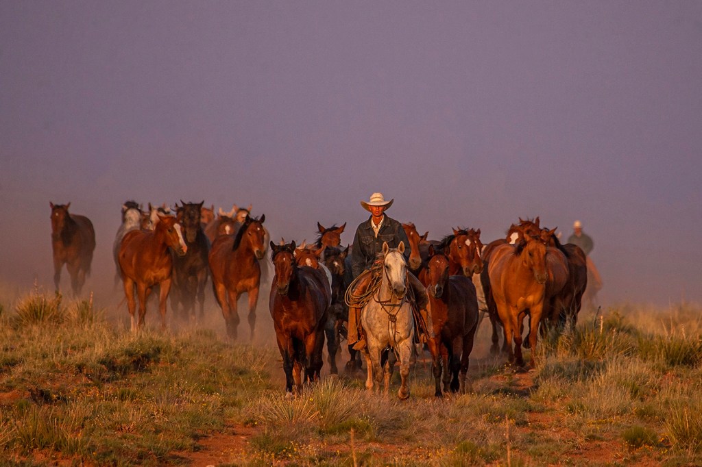 Brady Clark brings in the remuda at daybreak on the Bell Ranch in New Mexico. He and the crew were staying out with the wagon, living in teepees and wrangling horses at the time. Photo by Ross Hecox, Western Horseman, 2012