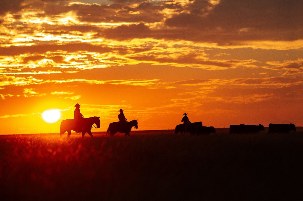 Hitch Ranch cowboys move yearlings to a new pasture at sundown in the Oklahoma Panhandle. The family-owned operation specializes in stocker calves with its feedlot, irrigated wheat fields and open pastures. Photo by Ross Hecox, Western Horseman, November 2017