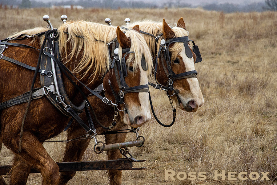 Two Belgian geldings named James and John pull a hay wagon on the Quarter Circle 99 near Loco, Oklahoma. Photo by Ross Hecox, 2024