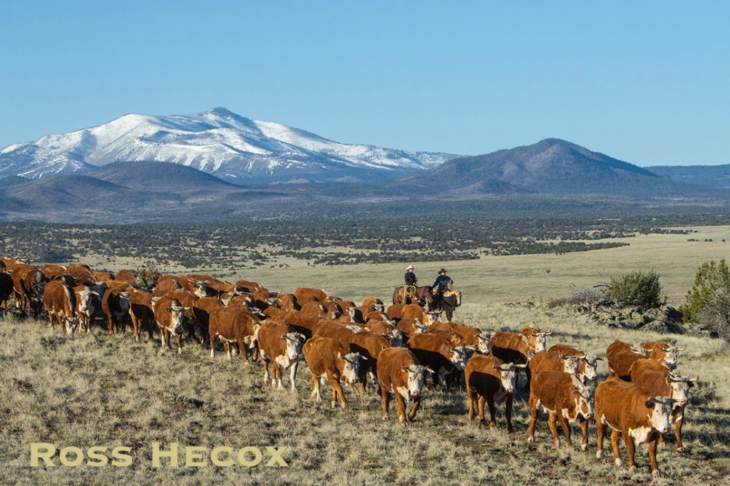 With Kendrick Peak in the background, Elizabeth and Benjamin Rodgers help move a set of Hereford cows on the Babbitt Ranch. The Arizona cow-calf operation has raised Horned Herefords for decades. Photo by Ross Hecox, May 2024